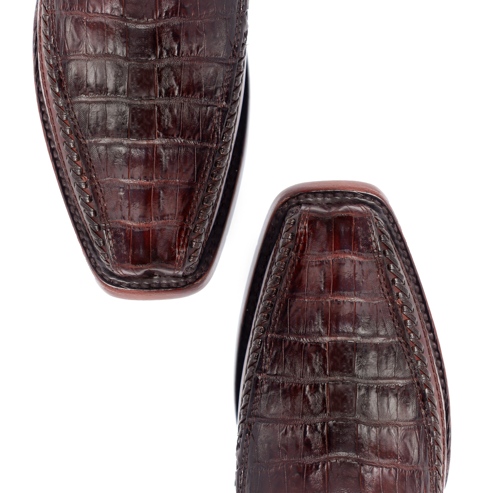 Bota modelo 8000 fabricada con piel genuina de caimán fuscus colombiano, complementada con tejido artesanal a mano y grabados láser. Cuenta con suela de cuero y construcción Goodyear Welt para máxima durabilidad.