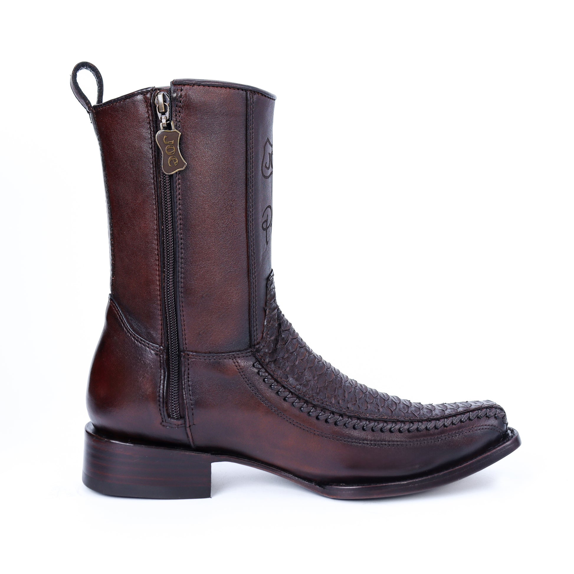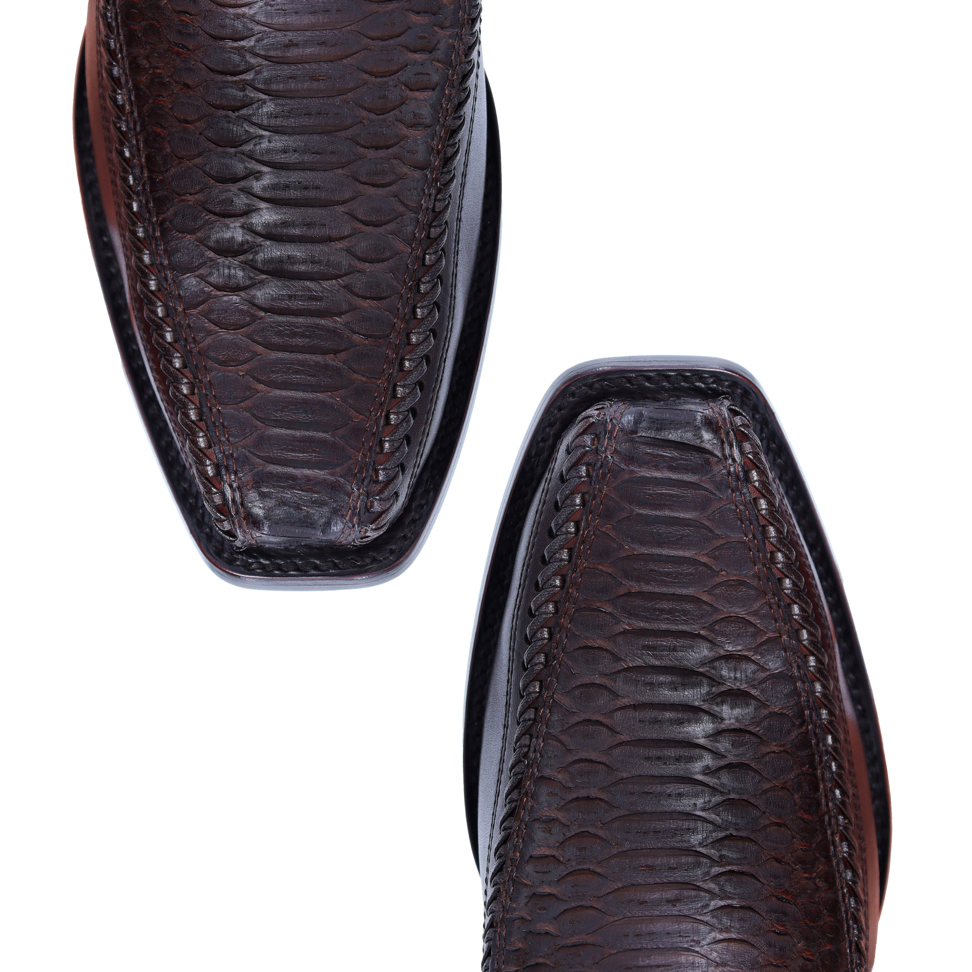 Bota modelo 8000 fabricada con piel genuina de pitón africano en acabado nobuck, complementada con piel de bobino, tejido artesanal a mano y grabados láser. Cuenta con suela de cuero y construcción Goodyear Welt para máxima durabilidad.