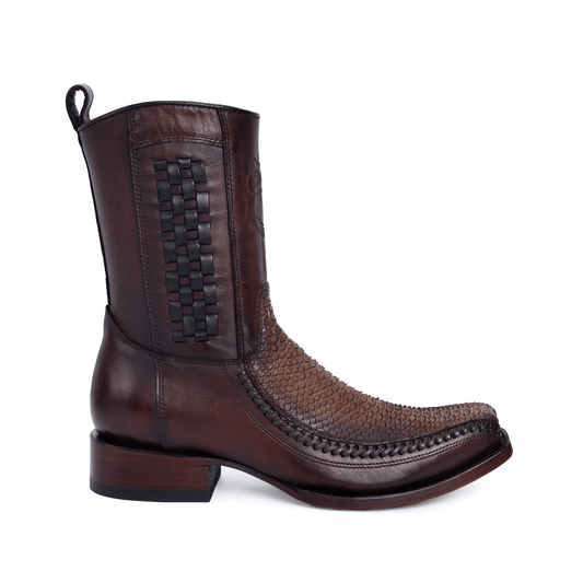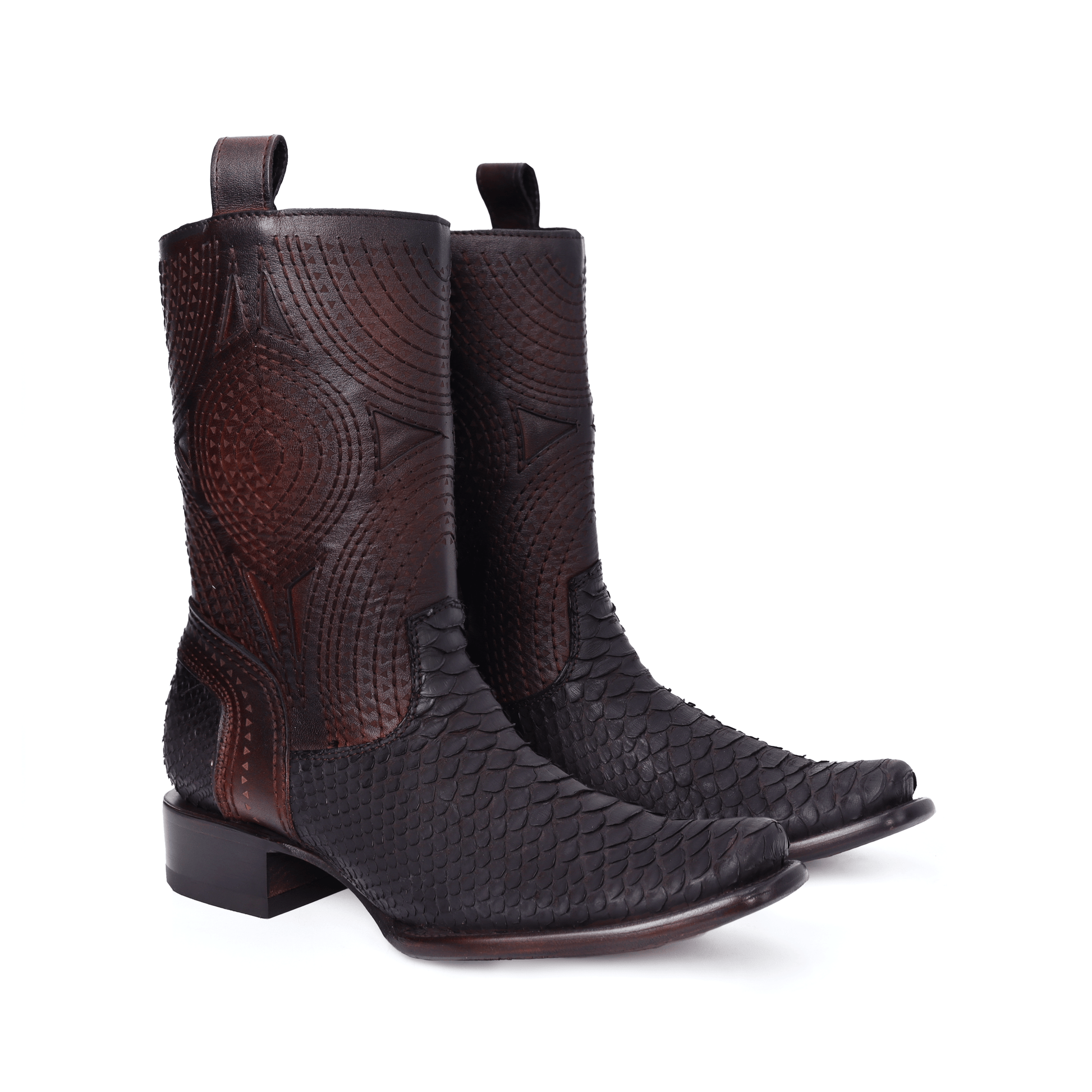 Bota Modelo Macam Pitón fabricada con piel genuina de pitón, complementada con difuminado a mano hecho con aerógrafo que crea un acabado único y exclusivo en cada par. Cuenta con suela de cuero con grabado láser para máxima durabilidad.